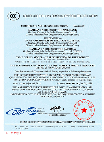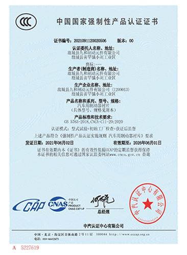 故城縣九和制動(dòng)元件有限公司主導(dǎo)產(chǎn)品為:汽車剎車片、裝載機(jī)剎車片。剎車片采用高溫高壓的熱壓工藝、設(shè)備、生產(chǎn)線、能保證質(zhì)量穩(wěn)定,有為主機(jī)廠配套生產(chǎn)的經(jīng)驗(yàn)和能力。劉如根商標(biāo)是公司主要商標(biāo),公司還有飛人標(biāo)牌、蛟龍牌、橫空出世等品牌!公司有多個(gè)剎車片檢驗(yàn)設(shè)備,剎車片摩擦性能定速摩擦試驗(yàn)機(jī)與國(guó)家非金屬礦制品檢驗(yàn)中心試驗(yàn)機(jī)是同公司生產(chǎn)的同型號(hào)試驗(yàn)機(jī)。拖曳試驗(yàn)機(jī)2020年通過中國(guó)建材檢驗(yàn)集團(tuán)咸陽有限公司檢驗(yàn)合格,剪切試驗(yàn)機(jī);布氏和洛氏試驗(yàn)機(jī)。2021年公司通過國(guó)家強(qiáng)制性CCC認(rèn)證、通過過19001-2000idt ISO 9001:2015質(zhì)量體系認(rèn)證,IATF16949認(rèn)證,歐盟Emark認(rèn)證。剎車片執(zhí)行GB/T11834-2011、GB 5763-2018標(biāo)準(zhǔn)。公司產(chǎn)品先后曾給山東臨工、徐工、卡特彼勒(山工)、徐州美馳車橋公司、肥城金城橋公司,山東路通橋箱科技公司,山東博士樂公司,郯城郯液公司,日照金···